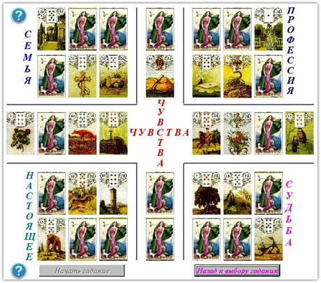 Мы предлагаем Вам уникальную, неповторимую систему гадания о прошлом, настоящем и будущем, которую оставила нам известная французская прорицательница – Мария-Анна-Аделаида Ленорман, в виде разработанной компьютерной программы “Гадание на картах”. Очень проста в использовании, с голосовыми подсказками – Вы услышите от гадалки описание каждой карты и узнаете результат гадания. Программа “Гадание на картах” – единственная в своем роде и состоит из четырех способов гадания: 1)Большой расклад: Большой расклад используется в случаях, когда Вам требуется составить развернутый прогноз на какой-либо промежуток времени. Перед перемешиванием карт - необходимо постараться мысленно задать картам программу - т. е. решить, какой промежуток времени вы хотите изучить... 2)Короткий Расклад: Короткий расклад используется для более тщательного и детального изучения какой-либо темы. В этом способе гадания уже имеет значение сочетание карт, а также их удаленность или близость к карте спрашивающего... 3)Расклад “Семь Домов”: Расклад "Семь Домов" рекомендуется применять, когда нужно составить достаточно более подробный прогноз на небольшой промежуток времени. Как показывает практика, события, прогнозируемые данным способом гадания, начинают происходить в течение ближайшего месяца... 4)Карта Личности: Способ гадания "Карта Личности" рекомендуется для любителей нумерологии. В этом способе гадания Вы узнаете свою “карту личности”, а также свой жизненный путь по дате рождения... Узнайте свое будущее и судьбу!