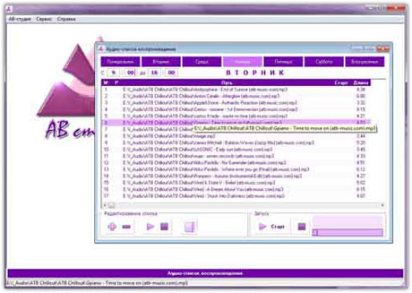 Мультимедийный программный комплекс для воспроизведения аудио рекламы в магазинах и супермаркетах. Помогает в автоматическом режиме организовать воспроизведение аудио рекламных роликов. Можно задать конкретное время проигрывания рекламы, автоматически задать время воспроизведения по алгоритму (например 10 раз за определенный промежуток времени). Если промежуток времени между соседними рекламными роликами не более 5 минут (можно опционально выбрать другое значение), ролики будут воспроизводится друг за другом. Время между рекламой можно также заполнить любым аудиофоном и утилита смешает музыкальный фон и рекламу. В назначенное время, программа плавно уберет громкость музыки, проиграет звук, который нужен перед рекламой, проиграет рекламный(ые) ролик(и), обозначит завершение рекламы и снова начнет воспроизводить музыкальный фон.