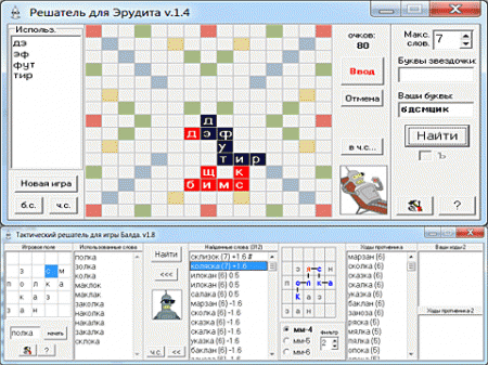 Эта программа содержит 2 решателя, для игры Балда и Эрудит. Они действуют как эрудированный помощник, составляя из букв самые лучшие слова. В решателе для балды реализована функция минимакса, которая за счет анализа ситуации на 4-6 хода вперед дает вам небольшое преимущество в игре против других программ, которые не имеют такой функции. Этот робожулик поможет вам легко выиграть любую партию.