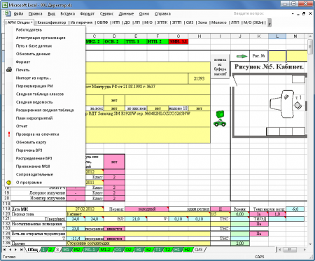 Программа по аттестации рабочих мест. Протоколы и карты аттестации, формируемые программой, соответствуют требованиям: «Порядок проведения аттестации рабочих мест по условиям труда», утвержденный приказом МЗСР РФ от 26.04.2011 г. № 342. Программа по АРМ представляет собой надстройку к редактору Microsoft Excel (дополнительное меню). Для каждого рабочего места создается отдельный файл шаблон-карта, который содержит саму карту и протоколы замеров.