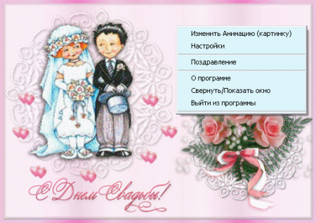Ваши друзья (подруги) женятся (выходят замуж), а вы не знаете как поздравить, где взять хорошее поздравление. Теперь проблема с поиском поздравлений решена. В программе "Поздравления с днем Свадьбы" есть множество поздравлений для молодоженов, а также для поздравления с годовщиной свадьбы. Все просто как некогда. Ну для красоты в программе можно поставить красивую анимацию на рабочий стол, которая послужит хорошим украшением.