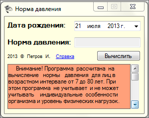 Предлагаемая программа позволяет вычислить норму давления (на основе принятых в медицине формул) для определенного возраста человека. Однако необходимо понимать, что полученные значения это лишь средний показатель, который может не соответствовать индивидуальной норме. Необходимо контролировать свое давление при периодических очных осмотрах лечащего врача даже в случае хорошего самочувствия и соответствия показателей текущего давления норме.