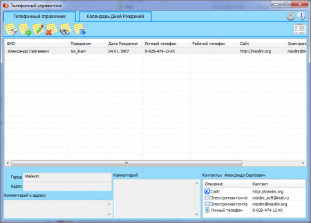 Бесплатная, удобная и простая в использовании программа Телефонный справочник. В программе Вы можете вести полнофункциональный телефонный справочник друзей, коллег по работе да и вообще всех кого знаете. Неограниченное количество контактов позволит заносить множество номеров на одного человека, например если у него несколько номеров, а также рабочие телефоны и другие. Удобный и быстрый поиск позволит без труда найти нужный контакт, но помимо поиска есть сортировка с помощью которой можно посмотреть список контактов, например на определенную букву. При написании программы были учтены пожелания пользователей других справочников, что сделало программу легче в использовании и не загруженной в интерфейсе, все понято с первого раза и удобно как некогда.