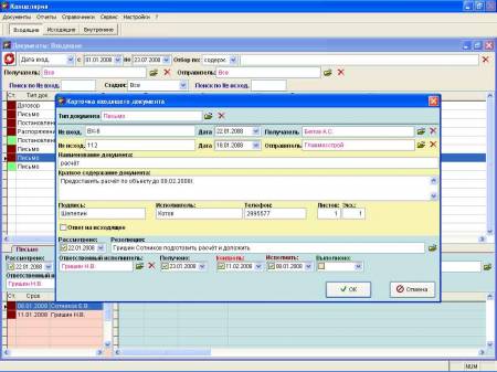 Программа предназначена для автоматизации электронного документооборота и делопроизводства на предприятии. Она позволяет сократить количество рутинных операций при работе с документами, минимизировать время их поиска по различным критериям и оперативно осуществлять контроль их исполнения. Программа ориентирована на обработку следующих видов документов: - входящей корреспонденции; - исходящей корреспонденции; - внутренних документов(приказы, служебные записки и т.д.); - договоров; - поручений. Программа имеет интуитивно-понятный интерфейс, который позволяет осуществлять: - регистрацию документов; - присоединение к рег. карточке любого количества электронных документов; - сканирование документов; - поиск документов по различным критериям; - назначение исполнителей и сроков исполнения заданий; - контроль исполнения документов и поручений в подразделениях организации; - формирование и ведение перечней документов в системе; - формирование документов из общего перечня в персональные и наоборот; - защиту системы от несанкционированного доступа; - администрирование прав доступа; - обработку всех документов в пределах единого информационного пространства; - автоматическую печать почтовых конвертов для отправления корреспонденции; - печать отчетов.