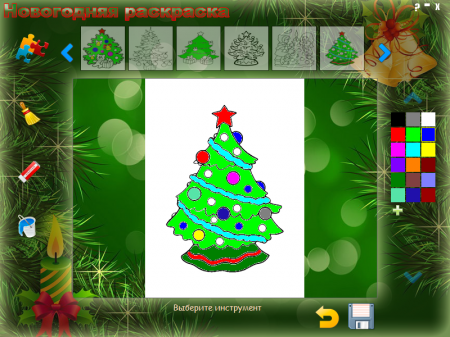 Увлекательная, бесплатная программа новогодней тематики для детей, которая позволит ребенку весело провести время за раскрашиванием новогодних картинок. Программа содержит разные картинки новогодних елочек, дед морозов и другие изображения для раскрашивания. Удобная сортировка картинок на разные темы по папкам. Разукрашенное изображение можно сохранить на компьютер. Программа не только приносит ребенку радость в рисовании, но и улучшает восприятие цветов, развивает мышление и фантазию. Ребенок должен развиваться, а не только играть в игры, и эта программа в этом поможет.