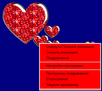 Как же много программ на новый год, новогодние елки, снежинки, гирлянды, но нет программ на день влюбленных. Хотя поправка уже есть :). День влюбленных программа которая отображает на рабочем столе красивую анимацию которая поможет создать Вам предпраздничное настроение, удивить любимую(любимого) а также украсит Ваш рабочий стол или рабочий стол своей любимой половинки. Анимаций просто огромное количество, на любой вкус и цвет :). Здесь и цветочки, и сердечки, и даже ангелки, но это еще не все, есть очень много других анимаций, а не понравились те которые есть, всегда можно загрузить еще :). Одна из главных возможностей программы это база поздравлений. Стихи, СМС поздравления, признания в любви и другое содержится в архиве поздравлений. Вот только чтобы увидеть поздравление необходимо подключение к интернету, так как вся база находится в интернете. В общем такая незаменимая программа которая пригодится всем влюбленным.