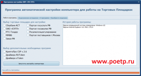 Программа автоматической настройки компьютера для работы на федеральных электронных торговых площадках позволяет владельцу ЭЦП нажатием одной кнопки получить готовый к работе компьютер. Программа настраивает компьютер пользователя в соответствии с требованиями законов № 63, 94, 44, 223 ФЗ. Данная программа одинаково подходит как Поставщикам, так и Заказчикам.