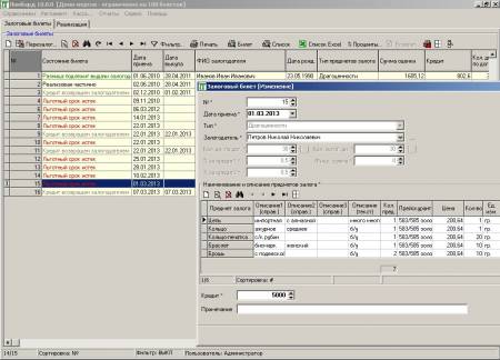 Программа для автоматизации оперативного учета в ломбарде. Схема начисления процентов – за фактический срок пользования кредитом. Возможность учета процентов до выкупа (в т.ч. ожидаемые проценты). За пользование кредитом залогодателем платятся проценты в ломбард (за фактическое количество дней): - проценты за пользование кредитом - от суммы кредита, - проценты за хранение - от суммы оценки. При этом весь период пользования может делиться на 2 интервала: количество дней по договору и после, соответственно для этих периодов можно поставить разные проценты за кредит в пределах одного билета. Есть возможность ставить разные проценты или количество дней по договору от билета к билету при его заполнении. Также реализована возможность автоматически проставлять проценты в случае, когда величина процента за кредит зависит от суммы кредита, количества дней по договору или типа предметов залога.
