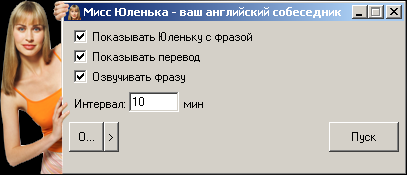 Программа предназначена для изучения английского без отрыва от работы за компьютером. Красивая девушка периодически появляется на экране и показывает и произносит ходовые фразы на английском. Вы можете настроить периодичность показа и действия Юленьки. Можно выводить только фразы, а можно включить их озвучивание и перевод.