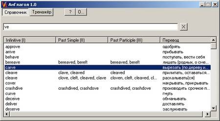 Программа АнГлагол имеет две функции: справочник и тренажёр. В режиме справочника она отображает более 1000 правильных и неправильных глаголов английского языка с их тремя формами и переводом. В программе есть удобный поиск по любой форме и переводу. Режим тренажёра позволит вам запомнить глаголы и их формы и, конечно, перевод. Вам просто необходимо по I форме ввести II и III и перевод, а программа проверит ответы и выдаст ваш результат в % по каждой форме.